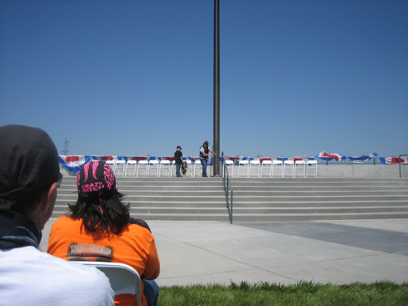 a wreath is placed at the base of the flag pole, ...
