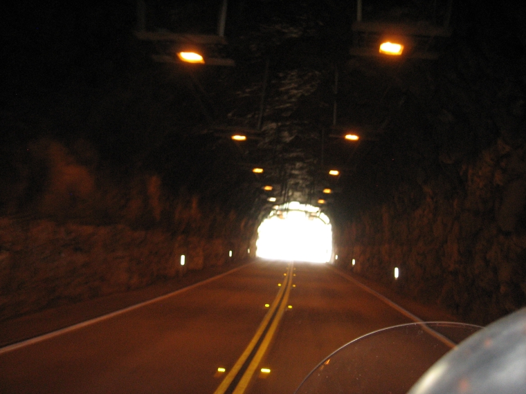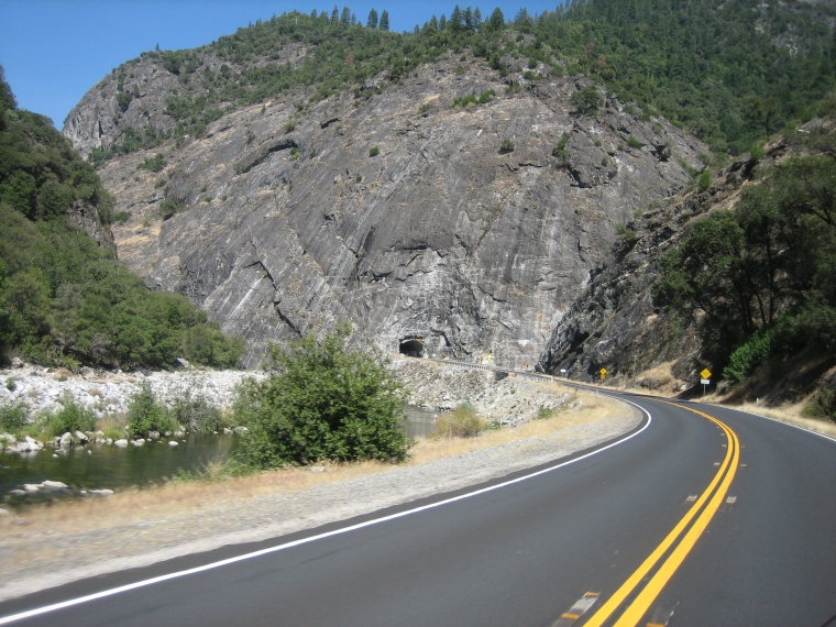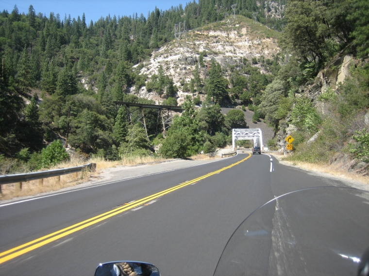The highway crosses the river over old bridges, goes through several tunnels, and even passes under a PG&E power plant that is built across and over the highway