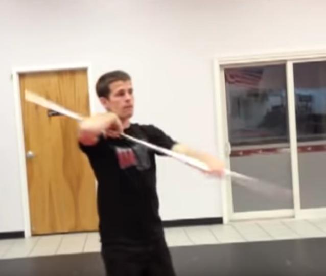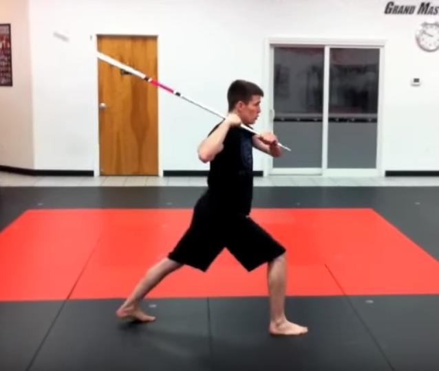 [NOTE: as you drop, keep tip of staff right where it was at end of the THRUST] |